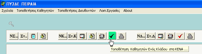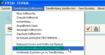Αφού περάσαμε τα κενά των σχολείων και τις προτιμήσεις των καθηγητών, προχωρούμε στην τοποθέτηση. Από το μενού "Τοποθετήσεις Καθηγητών - Τοποθέτηση καθηγητών ενός Κλάδου" ή με το πλήκτρο δίπλα στον εκτυπωτή, ανοίγουμε το παράθυρο της τοποθέτησης.
