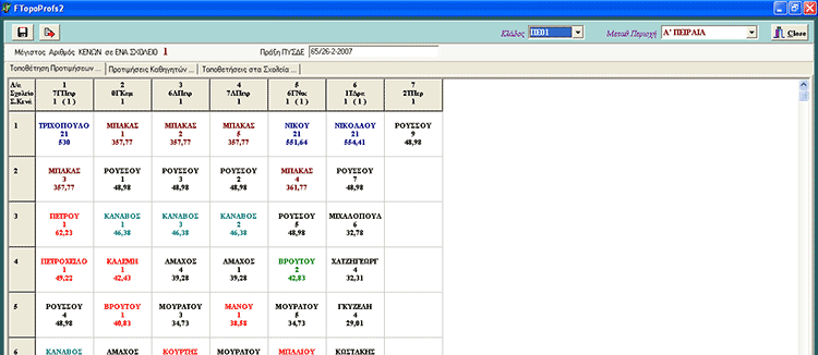 Εδώ επιλέγουμε κλάδο και περιοχή μετάθεσης από τα combo boxes πάνω δεξιά. Τα σχολεία βρίσκονται στην πρώτη οριζόντια γραμμή και από κάτω σε κατακόρυφες στήλες οι καθηγητές που τα ζητάνε, με φθίνουσα σειρά μορίων. Με μπλε χρώμα είναι οι αιτούντες βελτίωση οι οποίοι πριμοδοτούνται με 500 μόρια για τις ανάγκεςτου προγράμματος και μόνο, χωρίς φυσικά τα μόρια αυτά να φαίνονται στις τελικές καταστάσεις. Με μπορντώ χρώμα είναι οι ειδικής κατηγορίας οι οποίοι πριμοδοτούνται με 300 μόρια. Με κόκκινο χρώμα είναι οι έχοντες εντοπιότητα στο συγκεκριμμένο σχολείο, με πράσινο χρώμα οι έχοντες συνυπηρέτηση και με γαλαζοπράσινο χρώμα οι έχοντες εντοπιότητα και συνυπηρέτηση μαζί.