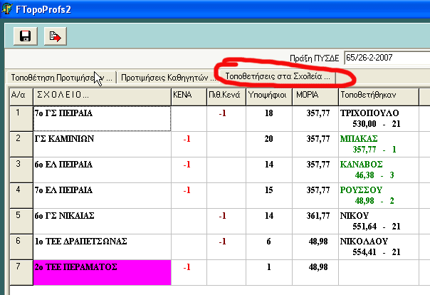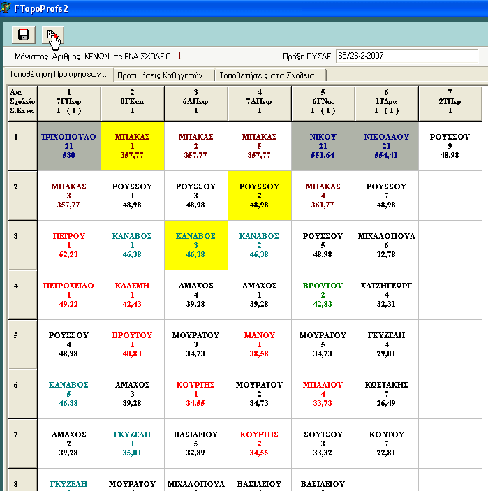 Γράφουμε τη πράξη του ΠΥΣΔΕ στο αντίστοιχο κουτάκι και ενεργοποιείται το πλήκτρο της τοποθέτησης με το κόκκινο βελάκι πάνω αριστερά. Το πατάμε και ταχύτατα γίνεται η τοποθέτηση (η Delphi πλεονεκτεί σε ταχύτητα έναντι της Visual Basic). Με κίτρινο χρώμα είναι οι τοποθετηθέντες στα σχολεία ενώ με γκρί χρώμα αυτοί που ζητούσαν βελτίωση και παραμένουν στην οργανική τους.