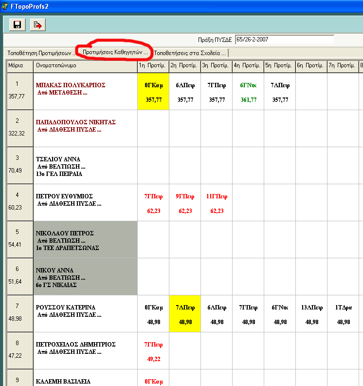 Επιλέγοντας "Προτιμήσεις Καθηγητών" έχουμε ένα πίνακα με τα ονόματα των καθηγητών και τις προτιμήσεις τους. Και πάλι με το ανάλογο χρώμα βλέπουμε την τοποθέτησή τους και αν παρέμειναν στην οργανική τους.