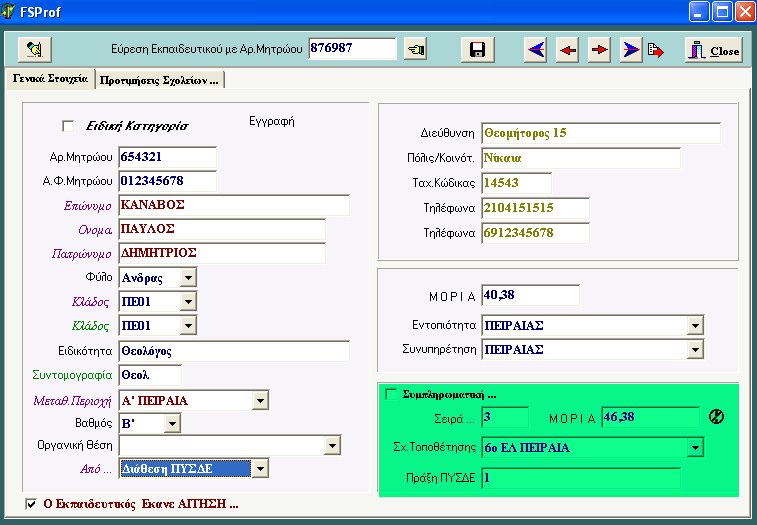 Πηγαίνοντας στη καρτέλλα κάθε καθηγητή, βλέπουμε ότι συμπληρώθηκε ο κάτω δεξιός πίνακας με τα στοιχεία της τοποθέτησης. Αν ο καθηγητής δεν τοποθετηθεί, ο πίνακας παραμένει κενός. Από εδώ μπορεί να γίνει και διόρθωση της τοποθέτησης με το "χέρι".