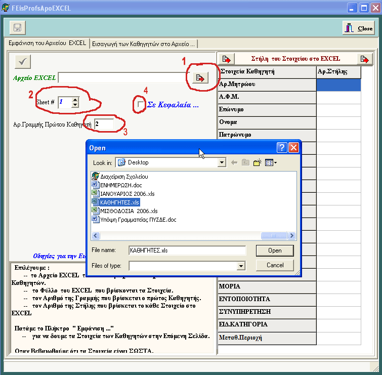 Από το πλήκτρο 1 βρίσκουμε τη διαδρομή του αρχείου excel (στο σκληρό μας ή το φλασάκι ή δισκέτα). Στο 2 βάζουμε τον αριθμό φύλλου στο οποίο έχουμε τα στοιχεία για ανάγνωση. Στο 3 τον αριθμό γραμμής στην οποία βρίσκεται ο πρώτος καθηγητής και τέλος αποτσεκάρουμε την επιλογή 4 "Σε Κεφαλαία..." ώστε να είναι οι χαρακτήρες ακριβώς όπως στο Excel.