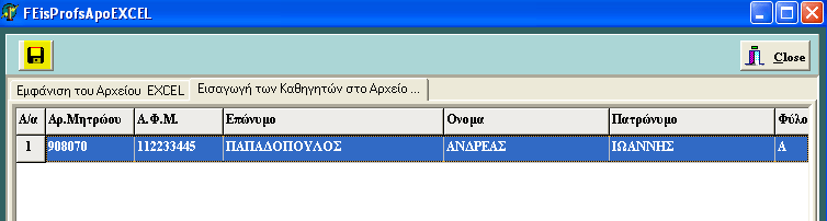 Μόλις τελειώσει η ανάγνωση, εμφανίζεται η φόρμα με τα στοιχεία όλων των καθηγητών (στο παράδειγμα έβαλα ένα μόνο όνομα). Αφού ελέγξω αν η ανάγνωση των στοιχείων έγινε με τη σωστή σειρά των στοιχείων, πατάω το πλήκτρο της αποθήκευσης.