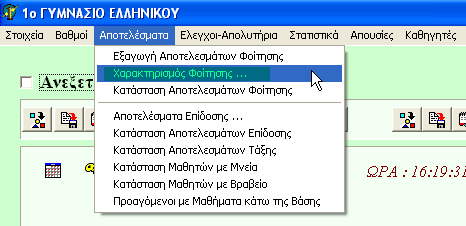 Από το μενού "Αποτελέσματα-Εξαγωγή Αποτελεσμάτων Φοίτησης" ανοίγουμε τη φόρμα εξαγωγής των αποτελεσμάτων φοίτησης. Σε καμμία περίπτωση δεν θα πρέπει να υπάρχει μαθητής -πλην αυτών που έφυγαν με μεταγραφή- χωρίς να έχουν περαστεί οι απουσίες του ή χωρίς να σημειωθεί ότι "Διέκοψε τη φοίτηση..." ή ως "Ουδόλως φοιτήσας...". Διαφορετικά είναι πιθανόν να προαχθεί μαθητής ο οποίος είναι απορριπτέος. Πάντοτε, μετά την εξαγωγή των αποτελεσμάτων, θα πρέπει να γίνεται ένας έλεγχος των ονομάτων για τη διαπίστωση πιθανού λάθους πριν την ανακοίνωση των αποτελεσμάτων!