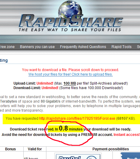 Οδηγίες για download από την RapishareΗ εταιρεία Rapidshare είναι μια Γερμανική εταιρεία που διαθέτει servers τεράστιας χωρητικότητας στους οποίους ο καθένας μπορεί να αποθηκεύει μεγάλα αρχεία, μεγέθους ακόμη και gigabytes! Επίσης ο καθένας μπορεί να κατεβάζει αρχεία από την Rapishare, αρκεί να ξέρει τις διευθύνσεις που είναι αποθηκευμένα. Βέβαια με μερικούς περιορισμούς, κυρίως χρονικούς, ώστε να σε αναγκάσουν να γίνεις συνδρομητής, οπότε αίρονται όλοι οι περιορισμοί! Όταν λοιπόν κάντε κλικ στον σύνδεσμο για να κατεβάσετε το αρχείο, σας οδηγεί στην παρακάτω σελίδα στην οποία κατεβαίνουμε στο κάτω μέρος και επιλέγουμε free: