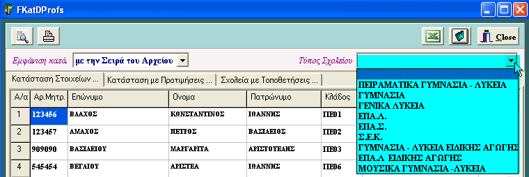 Από το μενού "Τοποθετήσεις Διευθυντών - Καταστάσεις..." ή από το εικονίδιο που βλέπετε παρακάτω (Κατάσταση Υποψηφίων Διευθυντών), εμφανίζεται πίνακας με τους υποψήφιους Διευθυντές και τα στοιχεία τους.
