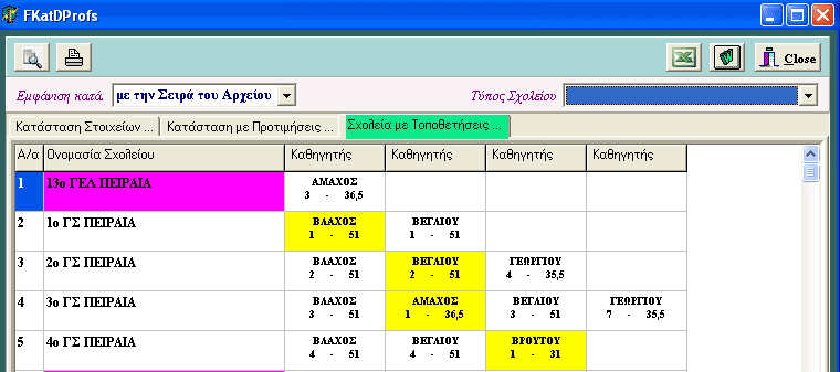 Επιλέγοντας "Κατάσταση με Προτιμήσεις" εμφανίζονται οι προτιμήσεις των σχολείων κάθε υποψήφιου και, εφόσον έγινε η τοποθέτηση, εμφανίζεται με κίτρινο χρώμα το σχολείο τοποθέτησης.