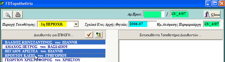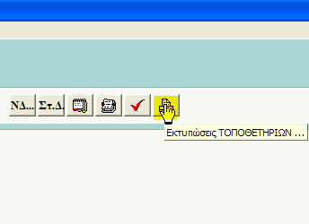 Από το μενού "Τοποθετήσεις Διευθυντών - Εκτυπώσεις των τοποθετηρίων... " ή από το εικονίδιο του εκτυπωτή που βλέπετε παρακάτω (Εκτύπωση ΤΟΠΟΘΕΤΗΡΙΩΝ), εμφανίζεται η φόρμα εκτύπωσης των τοποθετηρίων των Διευθυντών.