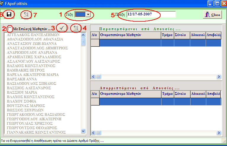 Επιλέγουμε από το 1 όλο το σχολείο ή κάποια τάξη, αν τσεκάρω το 2 (ενεργοποιούνται συγχρόνως και τα 3 - 4) μπορώ να επιλέξω με το αριστερό πλήκτρο του ποντικιού έναν ή περισσότερους μαθητές ή και όλους με το 3 ή να ακυρώσω την επιλογή με το 4. Συμπληρώνω την πράξη στο 5 και βγάζω τα αποτελέσματα και τα αποθηκεύω με το 6. Με το 7 ακυρώνω τα αποτελέσματα φοίτησης. ΠΡΟΣΟΧΗ! Γιαν α ενεργοποιηθεί το πλήκτρο 6, πρέπει να δώσουμε αριθμό πράξης!