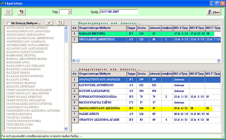 Πατώντας το πλήκτρο 6 αποθηκεύονται τα αποτελέσματα ενώ συγχρόνως εμφανίζονται στο δεξιό μέρος της φόρμας, τα ονόματα, οι απουσίες και οι Μ. Όροι των τριών τριμήνων των ΠΑΡΑΠΕΜΠΟΜΕΝΩΝ και των ΑΠΟΡΡΙΠΤΟΜΕΝΩΝ μαθητών.
