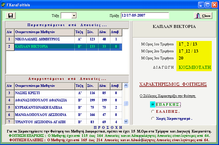 Το πρόγραμμα λαμβάνει υπόψη του για την εξαγωγή των αποτελεσμάτων φοίτησης, τα όρια τα οποία καθορίσαμε στη φόρμα ρυθμίσεων (βλέπε αρχικές ρυθμίσεις στην προηγούμενη σελίδα). Δεν λαμβάνει όμως υπόψη του την ευνοική ρύθμιση του Νόμου για την κατηγορία των μαθητών που έχουν Μ. Όρο στα τρίμηνα τουλάχιστον 15 και Διαγωγή Κοσμιοτάτη. Για αυτούς ο Σύλλογος, με ξεχωριστή πράξη, χαρακτηρίζει τη φοίτηση τους ως ΕΠΑΡΚΗ αν έχουν από 115 έως 164 Απουσίες και οι πλέον των 64 είναι όλες δικαιολογημένες ή ως ΕΛΛΙΠΗ αν έχουν από 165 έως 214 Απουσίες και οι πλέον των 64 είναι όλες δικαιολογημένες. Το πρόγραμμα μας δίνει τη δυνατότητα -μετά την έκδοση των αποτελεσμάτων φοίτησης- να χαρακτηρίσουμε τη φοίτηση των μαθητών αυτής της κατηγορίας. Στην προηγούμενη εικόνα των αποτελεσμάτων, βλέπουμε με κίτρινο χρώμα τη μαθήτρια ΜΑΝΩΛΟΠΟΥΛΟΥ ΔΕΣΠΟΙΝΑ, η οποία έχει 166 απουσίες και αδικαιολόγητες 47 και επομένως απορρίπτεται. Οι μέσοι όροι των τριμήνων όμως είναι σαφώς πάνω από 15 και έχει διαγωγή κοσμιοτάτη. Άρα η φοίτησή της μπορεί να χαρακτηρισθεί ως ΕΛΛΙΠΗΣ. Το ίδιο συμβαίνει και με τη μαθήτρια ΚΑΠΛΑΝ ΒΙΚΤΟΡΙΑ (πράσινο χρώμα) της οποίας η φοίτηση μπορεί να χαρακτηρισθεί ΕΠΑΡΚΗΣ. Για να γίνει αυτό, πηγαίνουμε στο μενού "Αποτελέσματα - Χαρακτηρισμός φοίτησης", και ανοίγουμε τη φόρμα χαρακτηρισμού φοίτησης.