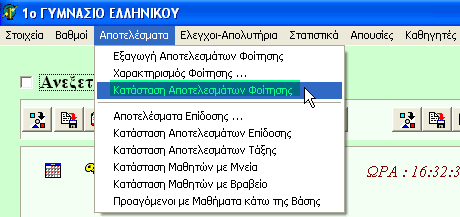 Από το μενού "Αποτελέσματα-Κατάσταση Αποτελεσμάτων Φοίτησης" ανοίγουμε τη φόρμα των καταστάσεων αποτελεσμάτων φοίτησης.