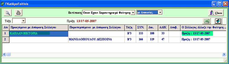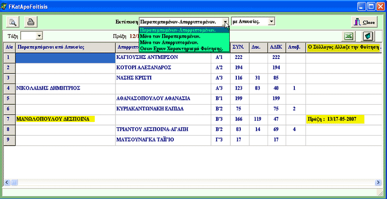 Μπορούμε να επιλέξουμε κατηγορία (πράσινο χρώμα), να φαίνονται ή όχι οι απουσίες, να κάνουμε προεπισκόπιση, εκτύπωση ή εξαγωγή σε αρχείο excel ή word. Με κίτρινο χρώμα βλέπουμε τη μαθήτρια της οποίας ο Σύλλογος άλλαξε τη φοίτηση καθώς και την πράξη.